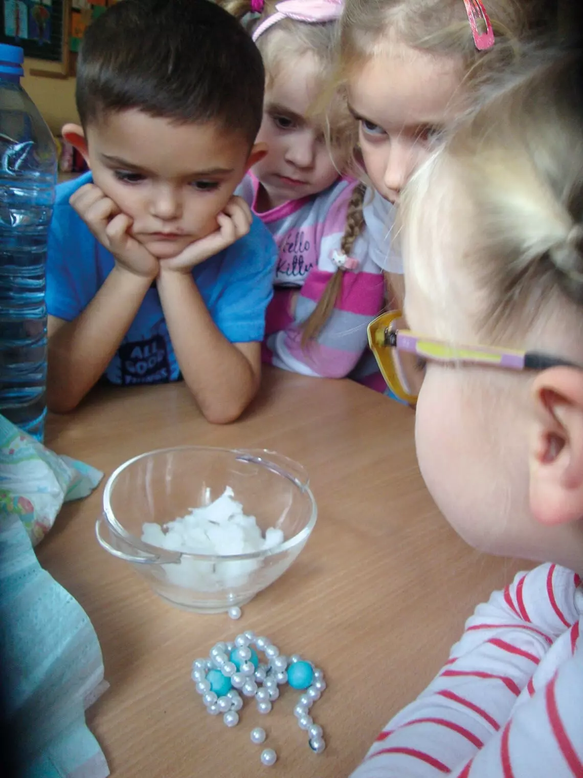 Dzieci mogą zbudować model polimeru z białych koralików imitujących pojedyncze cząstki zwane monomerami, nadziewając je na drucik i skręcając w formę przestrzenną. Włożone między poskręcany łańcuch przezroczyste lub jasnoniebieskie kulki będą imitowały cząsteczki wody. I to pozwoli lepiej zrozumieć, jak to się dzieje, że woda „znika” w białym proszku. Można jeszcze dodać, że zawarty w pieluchach proszek jest superabsorbentem (bardzo dobrze chłonie wodę). Oczywiście nie należy wymagać od dzieci czynnego posługiwania się naukową terminologią. Na razie wystarczy oswajanie, na wszystko inne przyjdzie czas.